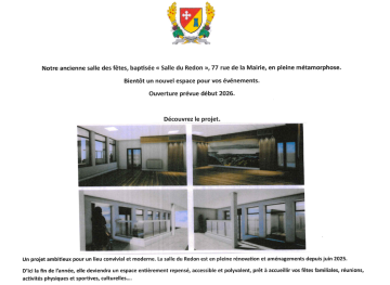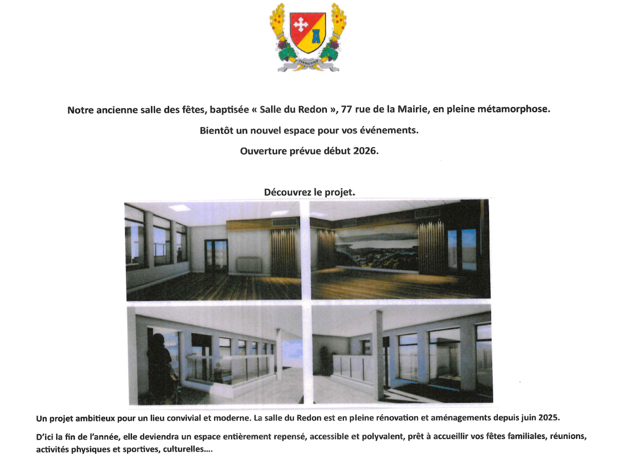 Un projet ambitieux pour un lieu convivial et moderne. La salle du Redon est en pleine rénovation et aménagements depuis juin 2025. D'ici la fin de l'année, elle deviendra un espace entièrement repensé, accessible et polyvalent, prêt à accueillir vos fêtes familiales, réunions, activités physiques et sportives, culturelles....